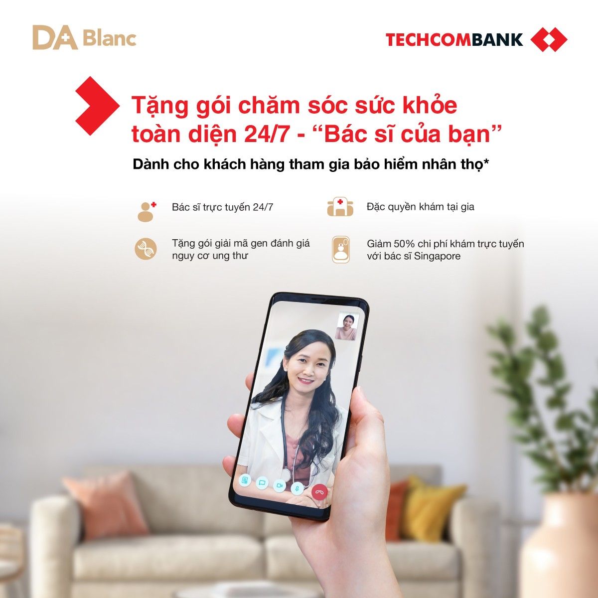 Theo thoả thuận, các khách hàng tham gia bảo hiểm với khoản phí định kỳ theo năm từ 25 triệu trở lên qua Techcombank và đáp ứng theo thể lệ chương trình sẽ được nhận gói dịch vụ chăm sóc sức khỏe cao cấp DA Blanc (thương hiệu thuộc Doctor Anywhere) trong chương trình “Bác sĩ của bạn”.