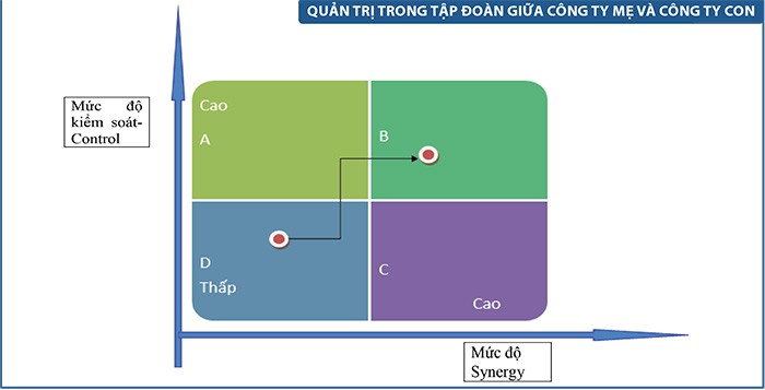 Câu hỏi thường được đặt ra là công ty mẹ (holdings) làm gì với các công ty con để thể hiện quyền chủ sở hữu của mình và phát huy được hiệu quả hoạt động của toàn tập đoàn? Có thể diễn giải một cách đơn giản: chức năng quản trị của công ty mẹ với các công ty con theo hai nhóm: (1) quyết định mức độ kiểm soát (control); (2) mức độ phối hợp hay hợp lực (synergy).