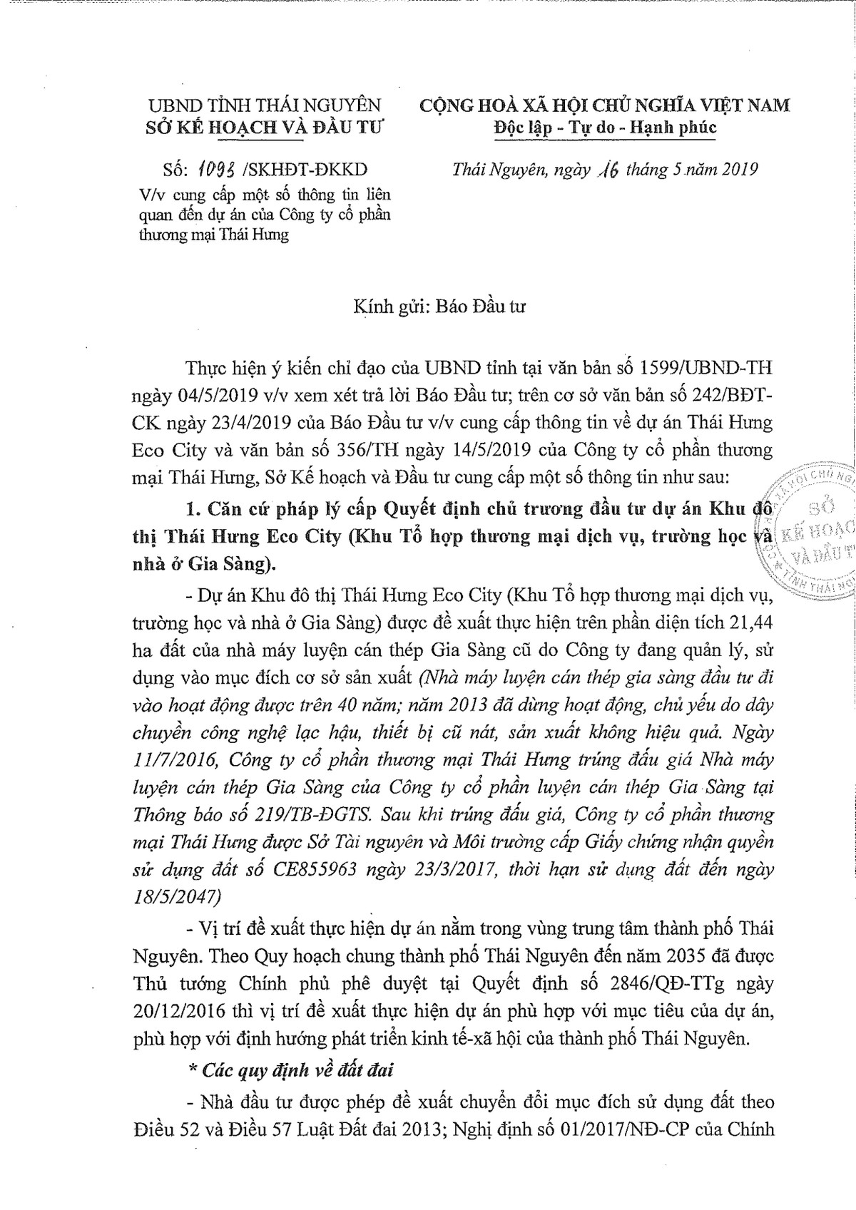 Từ yêu cầu này, Sở Kế hoạch và Đầu tư Thái Nguyên cũng đã có Công văn số 1093/SKHĐT-ĐKKD ngày 16/5/2019 gửi Báo Đầu tư, cho biết các thông tin cơ bản của dự án Khu đô thị Thái Hưng Eco City. Theo đó, dự án này đề xuất thực hiện trên phần diện tích 21,44 ha đất của Nhà máy Luyện cán thép Gia Sàng cũ do Công ty Thái Hưng đang quản lý, sử dụng vào mục đích cơ sở sản xuất.