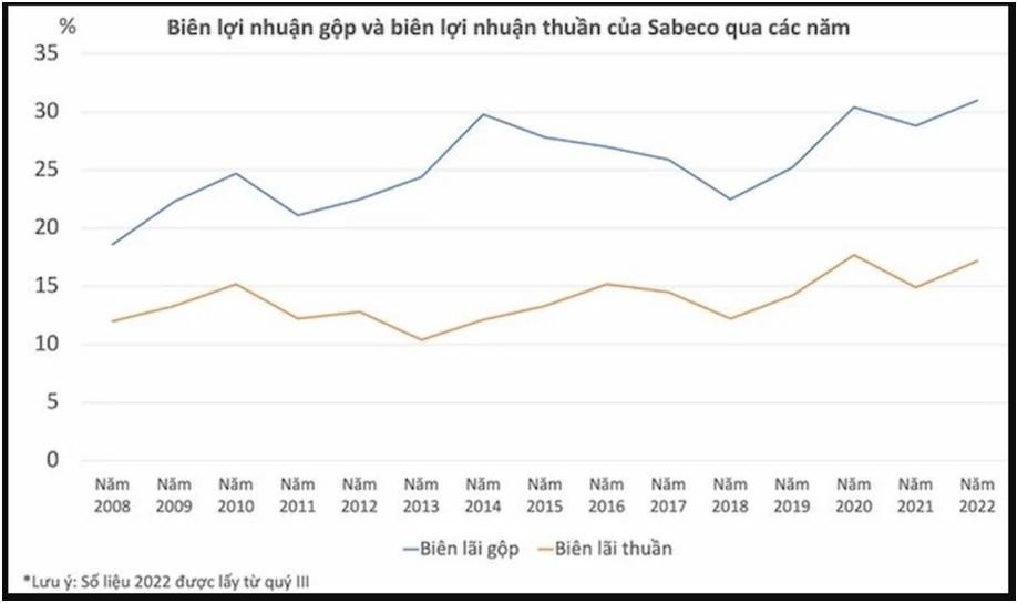 Về tình hình kinh doanh của Sabeco, trong quý III/2022, Sabeco ghi nhận doanh thu đạt 8.635,08 tỷ đồng, tăng 101,6% so với cùng kỳ và lợi nhuận sau thuế đạt 1.394,6 tỷ đồng, tăng 195,5% so với cùng kỳ năm trước. Đáng chú ý, biên lợi nhuận doanh nghiệp cải thiện từ 26,7% lên 31,2%.