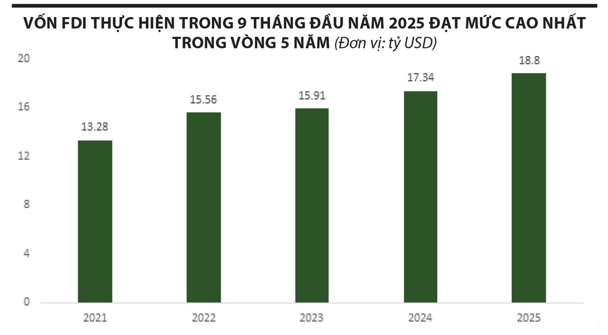 Sau khi Việt Nam và Mỹ đạt được thỏa thuận về thuế đối ứng, kỳ vọng về làn sóng đầu tư nước ngoài mới vào Việt Nam đang gia tăng rõ rệt. Dù thỏa thuận này mới được công bố gần đây, số liệu 9 tháng đầu năm 2025 đã cho thấy niềm tin vững chắc của nhà đầu tư quốc tế: tổng vốn FDI đăng ký đạt 28,5 tỷ USD, tăng 15,2% so với cùng kỳ; vốn thực hiện đạt 18,8 tỷ USD - mức cao nhất trong 5 năm qua.