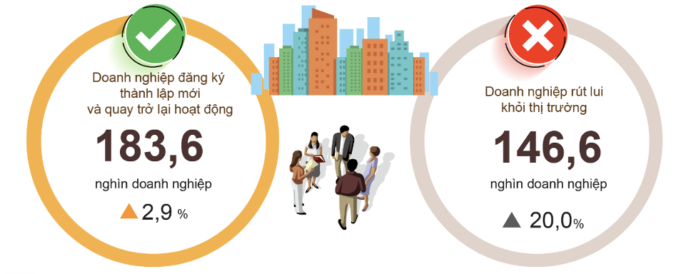Tính chung 10 tháng năm 2023, số doanh nghiệp tạm ngừng kinh doanh có thời hạn là 81.000 doanh nghiệp, tăng 22,1% so với cùng kỳ năm trước; 50.700 doanh nghiệp ngừng hoạt động chờ làm thủ tục giải thể, tăng 25,9%; 14.700 doanh nghiệp hoàn tất thủ tục giải thể, giảm 4,5%. Tính chung, có 146.600 doanh nghiệp rút lui khỏi thị trường trong 10 tháng qua, tăng 20%. Bình quân một tháng có 14.700 doanh nghiệp rút lui khỏi thị trường.
