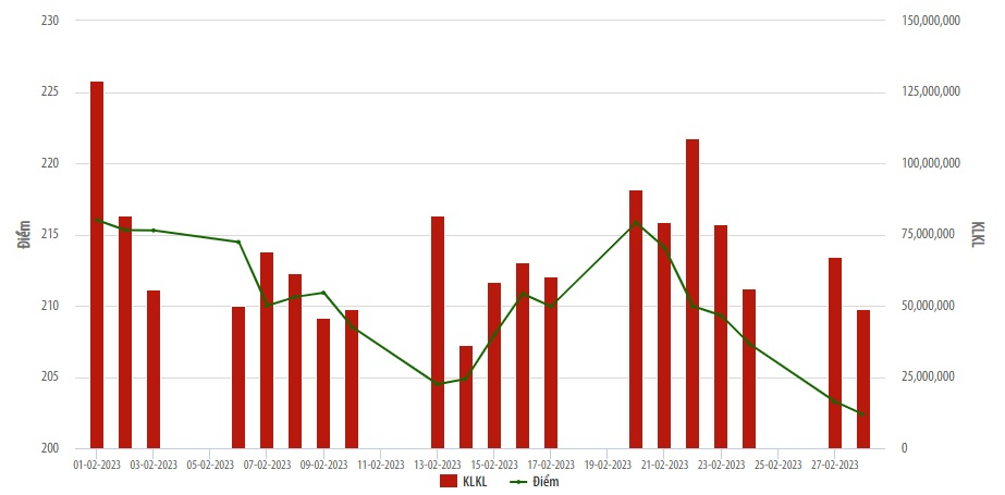Chỉ số HNX-Index biến động tăng, giảm mạnh trong biên độ từ 202,38 - 216,01 điểm và đóng cửa phiên cuối cùng của tháng vào ngày 28/2 đạt mức thấp nhất tháng là 202,38 điểm, giảm 9,01% so với thời điểm cuối tháng 1/2023.