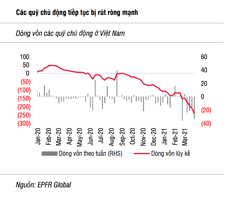 Dòng vốn rút ròng liên tục tại các quỹ đầu tư chủ động trong cả tháng vừa qua. Theo dữ liệu EPFR, thị trường Việt Nam bị rút ròng 100 triệu USD và là tháng rút ròng lớn nhất kể từ tháng 3/2020 đến nay.