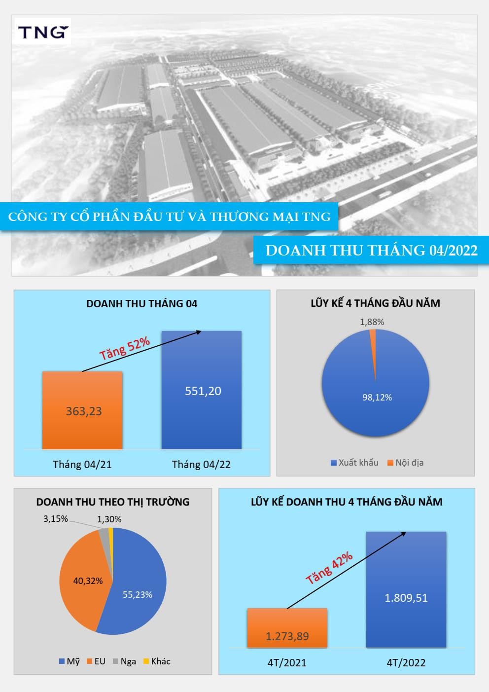 Lũy kế 4 tháng đầu năm 2022, TNG ghi nhận doanh thu đạt 1.809,5 tỷ đồng, tăng 42% so với cùng kỳ năm 2021. Trong đó, doanh thu xuất khẩu chiếm 98,12% và doanh thu nội địa chiếm 1,88%.