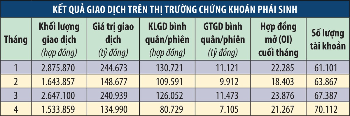 Trong khi đó, số lượng tài khoản giao dịch phái sinh vẫn tăng theo từng tháng, thời điểm cuối tháng 4 đạt 70.112 tài khoản, tăng hơn 4% so với cuối tháng 3 và tăng 21,5% so với đầu năm.