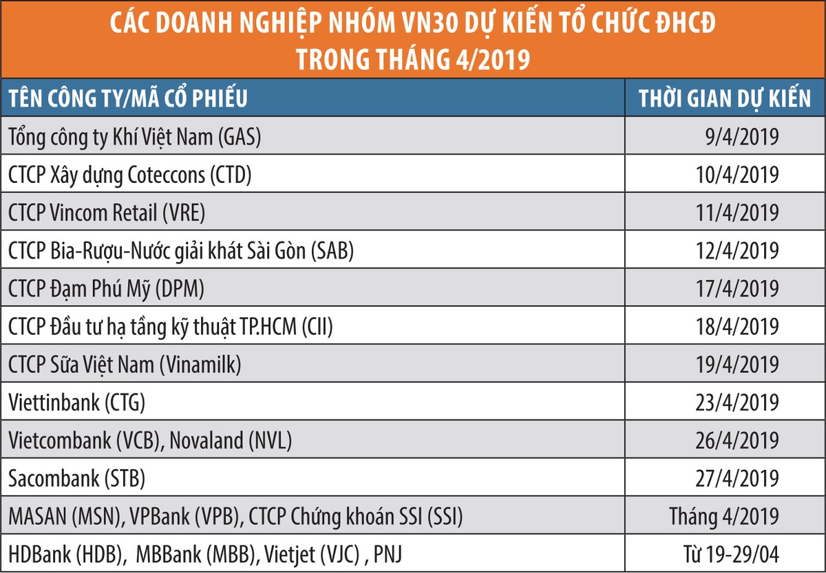 Một trong những điểm nhấn được chú ý khi bước sang tháng 4 tiếp tục đến từ mùa đại hội 2019, với hàng loạt doanh nghiệp lớn lên lịch tổ chức trong tháng này như Tổng công ty Khí Việt Nam (GAS), CTCP Bia-Rượu-Nước giải khát Sài Gòn, Tập đoàn Masan, CTCP Hàng không Vietjet hay HDBank, Vietcombank, Sacombank, Vietinbank, MBBank…