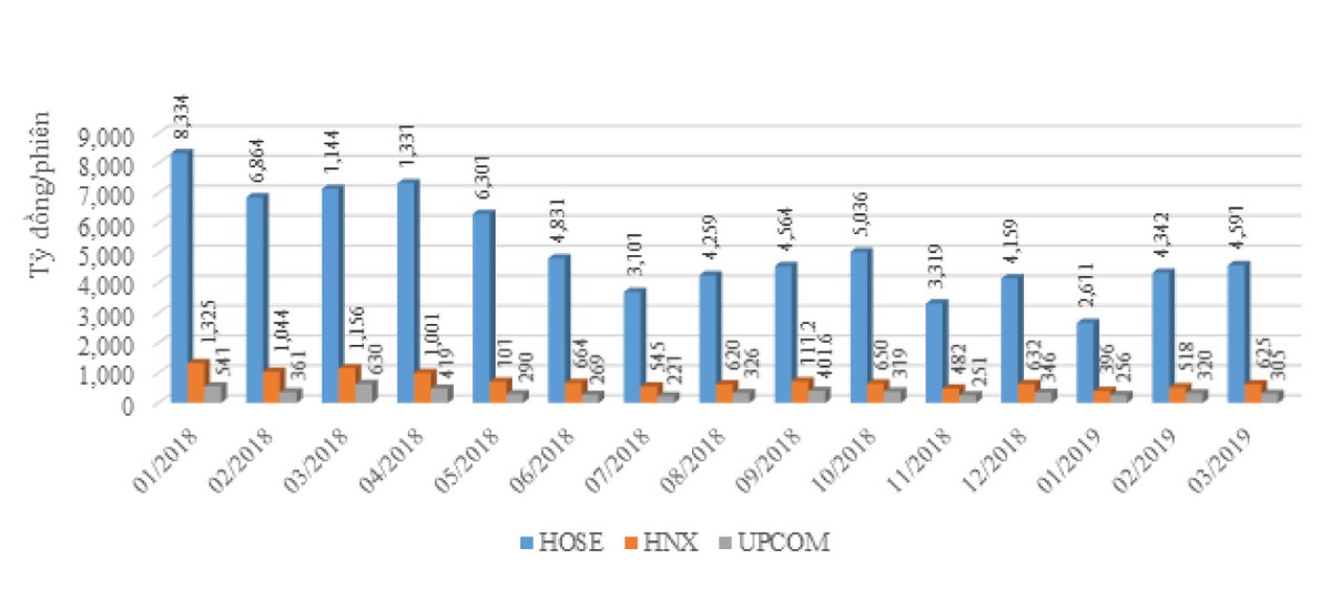 Tuy vậy, trái ngược xu hướng giao dịch tích cực của khối ngoại, giao dịch của khối nội lại tỏ ra khá dè dặt, khiến thanh khoản chung tiếp tục sụt giảm. Trên sàn HOSE, giá trị giao dịch bình quân trong quý I/2019 chỉ đạt 3.785 tỷ đồng/phiên, giảm đến 50% so với cùng kỳ năm 2018. So với trung bình cả năm 2018 (5.427 tỷ đồng/phiên), giá trị giao dịch quý I cũng thấp hơn 30,2%.