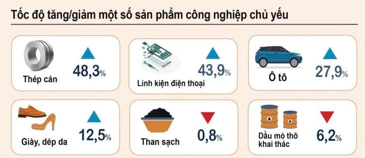 Một số sản phẩm công nghiệp chủ yếu 8 tháng năm 2021 tăng so cao với cùng kỳ năm trước là thép cán tăng 48,3%, linh kiện điện thoại tăng 43,9%, ô tô tăng 27,9%, sắt, thép thô tăng 13,7%, giày, dép da tăng 12,5%, phân hỗn hợp NPK tăng 12,3%, sữa bột tăng 11,1%, khí hóa lỏng LPG tăng 10,6%, điện thoại di động tăng 10%, thức ăn cho gia súc tăng 9,2%, vải dệt từ sợi tự nhiên tăng 6,7%.