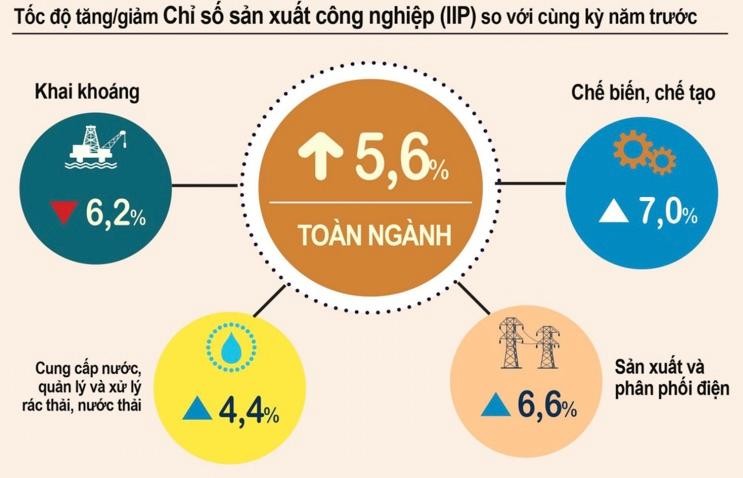 Trong đó, ngành chế biến, chế tạo tăng 7% (cùng kỳ năm 2020 tăng 3,7%), đóng góp 5,9 điểm phần trăm vào mức tăng chung; ngành sản xuất và phân phối điện tăng 6,6%, đóng góp 0,6 điểm phần trăm; ngành cung cấp nước, hoạt động quản lý và xử lý rác thải, nước thải tăng 4,4%, đóng góp 0,1 điểm phần trăm; riêng ngành khai khoáng giảm 6,2%, làm giảm 1 điểm phần trăm trong mức tăng chung.