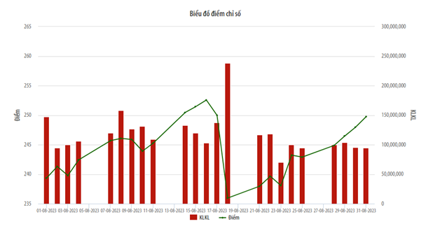 Chỉ số HNX-Index cao nhất tháng đạt 252,56 điểm vào ngày 16/8/2023, tăng 5,43% so với thời điểm cao nhất tháng 7/2023. Đây cũng là mức cao nhất kể từ đầu năm của chỉ số HNX-Index.