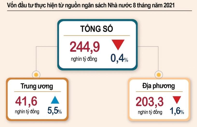 Tính chung 8 tháng năm 2021, vốn đầu tư thực hiện từ nguồn ngân sách nhà nước đạt 244.900 tỷ đồng, bằng 51,1% kế hoạch năm và giảm 0,4% so với cùng kỳ năm trước (cùng kỳ năm 2020 bằng 48% và tăng 28%), bao gồm vốn Trung ương quản lý đạt 41.600 tỷ đồng, bằng 49,6% kế hoạch năm và tăng 5,5% so với cùng kỳ năm trước; vốn địa phương quản lý đạt 203.300 tỷ đồng, bằng 51,5% kế hoạch năm và giảm 1,6%.