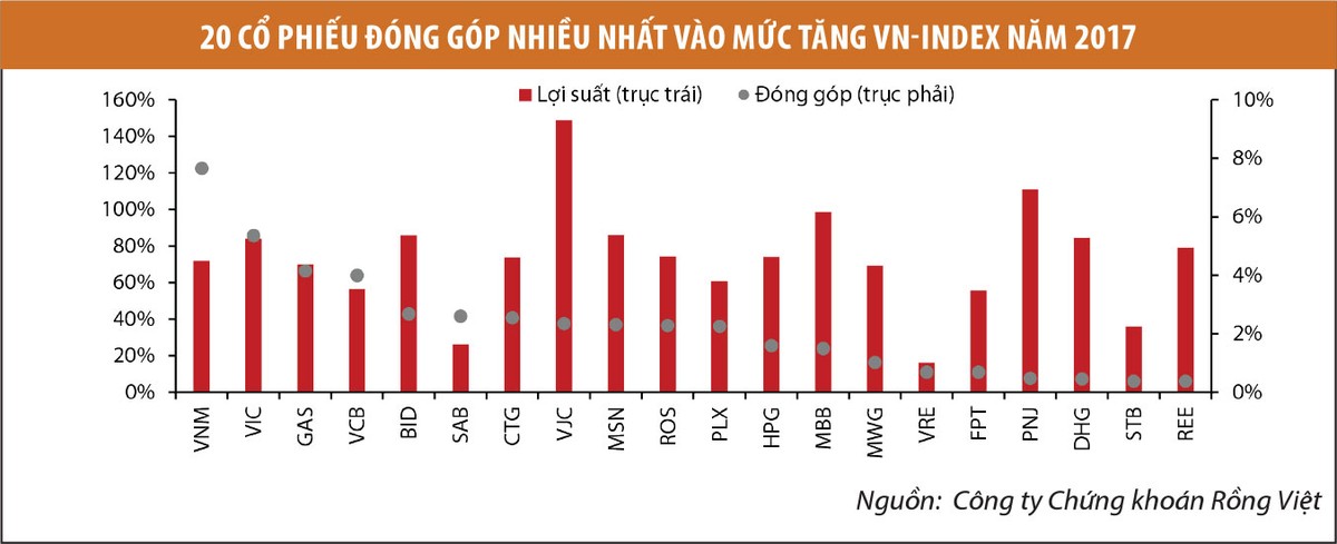 Nhờ hấp lực tốt với dòng tiền, Rồng Việt cho rằng, phân bổ một phần danh mục đầu tư vào nhóm cổ phiếu vốn hóa lớn có thể mang lại tỷ suất lợi nhuận cao năm 2018. Tuy nhiên, ở mức PE khá cao hiện tại, rủi ro đi cùng ở nhóm này cũng cao tương ứng nếu các quỹ mở đột ngột bị rút vốn.