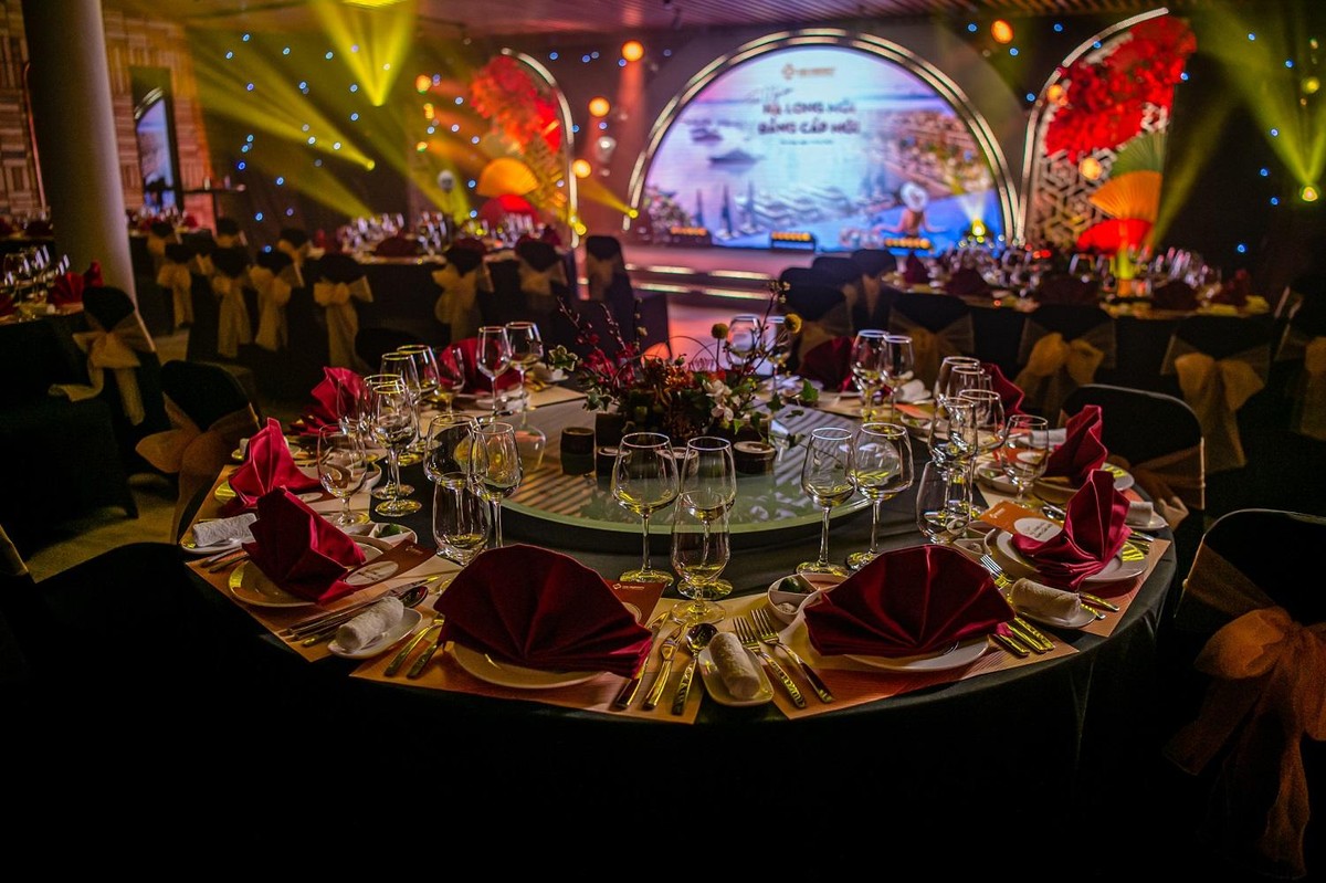 Khi màn đêm buông xuống Vịnh di sản kì ảo cũng là lúc đêm gala sôi động bắt đầu. Màu đỏ của hoa anh đào, nghệ thuật cắm hoa truyền thống Ikebana cùng các chất liệu như giấy, gỗ, nan tre của xứ Phù Tang được sử dụng tối đa trong trang trí mang tới không gian tiệc đậm màu Nhật Bản.