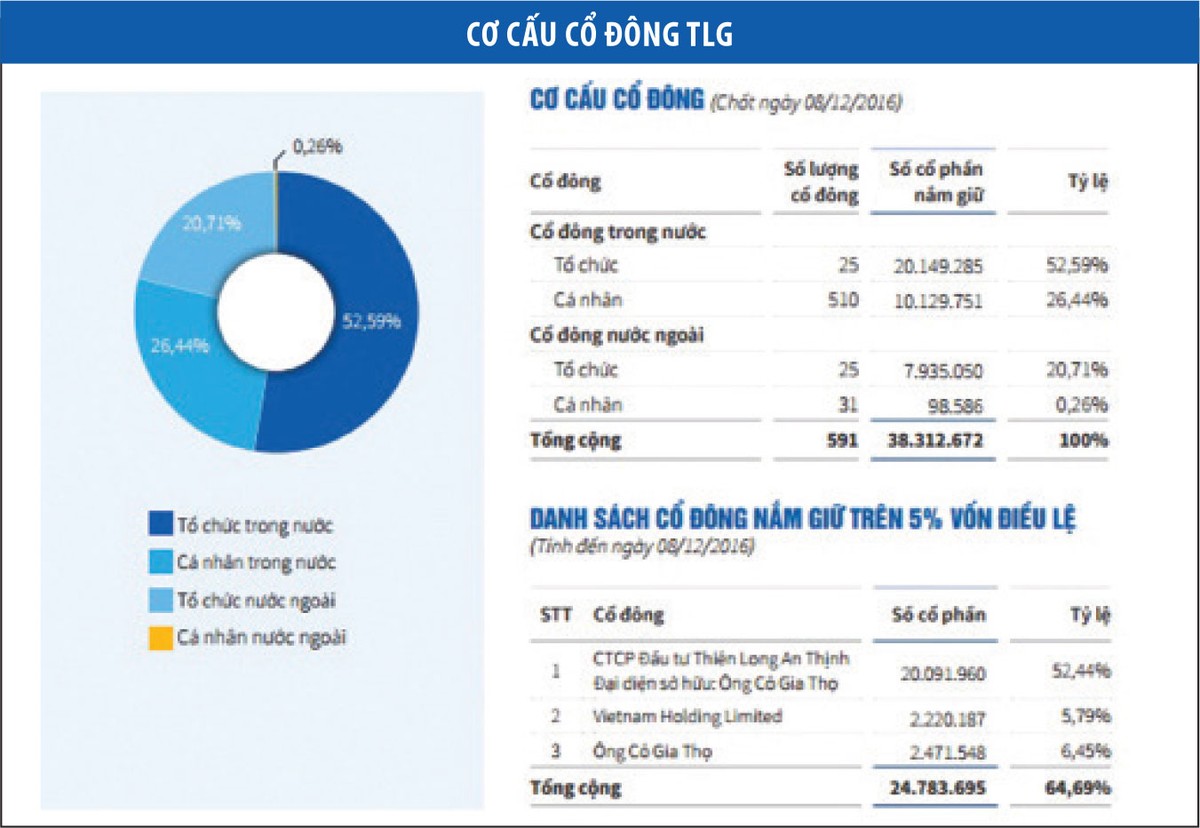 Sở dĩ thanh khoản cô đặc vì Công ty có 95% vốn do cổ đông nội bộ và cổ đông ngoại nắm giữ. Tính đến 31/12/2016, cổ đông lớn nhất của TLG là CTCP Đầu tư Thiên Long An Thịnh với sở hữu 52,44% vốn, riêng Chủ tịch HĐQT công ty này, ông Cô Gia Thọ nắm giữ 6,45% vốn TLG. Vietnam Holding Limited hiện nắm 5,79% vốn.