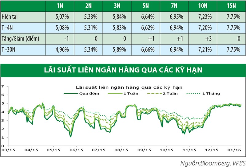 Dù một khối lượng lớn giao dịch reverse repo đến hạn trên thị trưởng mở, nhưng thanh khoản của hệ thống vẫn khá tốt vì các ngân hàng dường như đã chuẩn bị sẵn sàng số tiền này. Hơn nữa, NHNN vẫn bơm tiền thông qua thị trường mở để hỗ trợ thanh khoản thị trường. Kết thúc tuần, lãi suất các kỳ hạn tham khảo như sau: qua đêm (4,7%/năm, -10 điểm), 1 tuần (4,8%/năm, -10 điểm), 2 tuần (4,8%/năm, -10 điểm) và 1 tháng (4,9%/năm, 0 điểm).