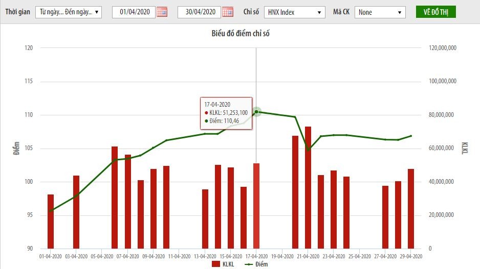 Tháng 4/2020, theo HNX, diễn biến của chỉ số HNX Index tháng 4/2020 có xu hướng tăng điểm từ mức thấp nhất 95,61 điểm vào ngày 1/4/2020. Sau khi đạt mức cao nhất 110,04 điểm vào ngày 17/4/2020, chỉ số HNX Index đã có phiên giảm mạnh và đi ngang tới hết tháng.