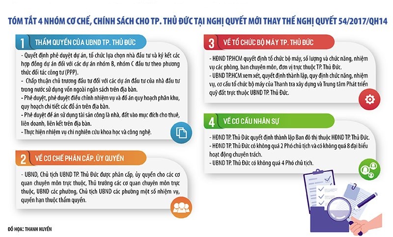 Trong đó, xác định nhiều thẩm quyền cho UBND Thành phố, như các thẩm quyền liên quan đến thẩm định chủ trương đầu tư, thẩm định quyết định phê duyệt dự án; quyết định phê duyệt dự án, tổ chức lựa chọn nhà đầu tư và ký kết các hợp đồng dự án đối với các dự án nhóm B, nhóm C đầu tư theo phương thức đối tác công tư; chấp thuận chủ trương đầu tư đối với các dự án đầu tư của nhà đầu tư trong nước sử dụng vốn ngoài ngân sách trên địa bàn TP. Thủ Đức; phê duyệt đề án sử dụng tài sản công là nhà, đất vào mục đích cho thuê, liên doanh, liên kết trên địa bàn TP. Thủ Đức...