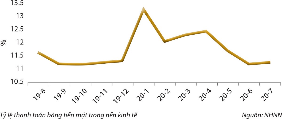 Tính đến tháng 7/2020, số liệu của Ngân hàng Nhà nước cho thấy tỷ lệ tiền mặt trên tổng phương tiện thanh toán (M2) là 11,28%.
