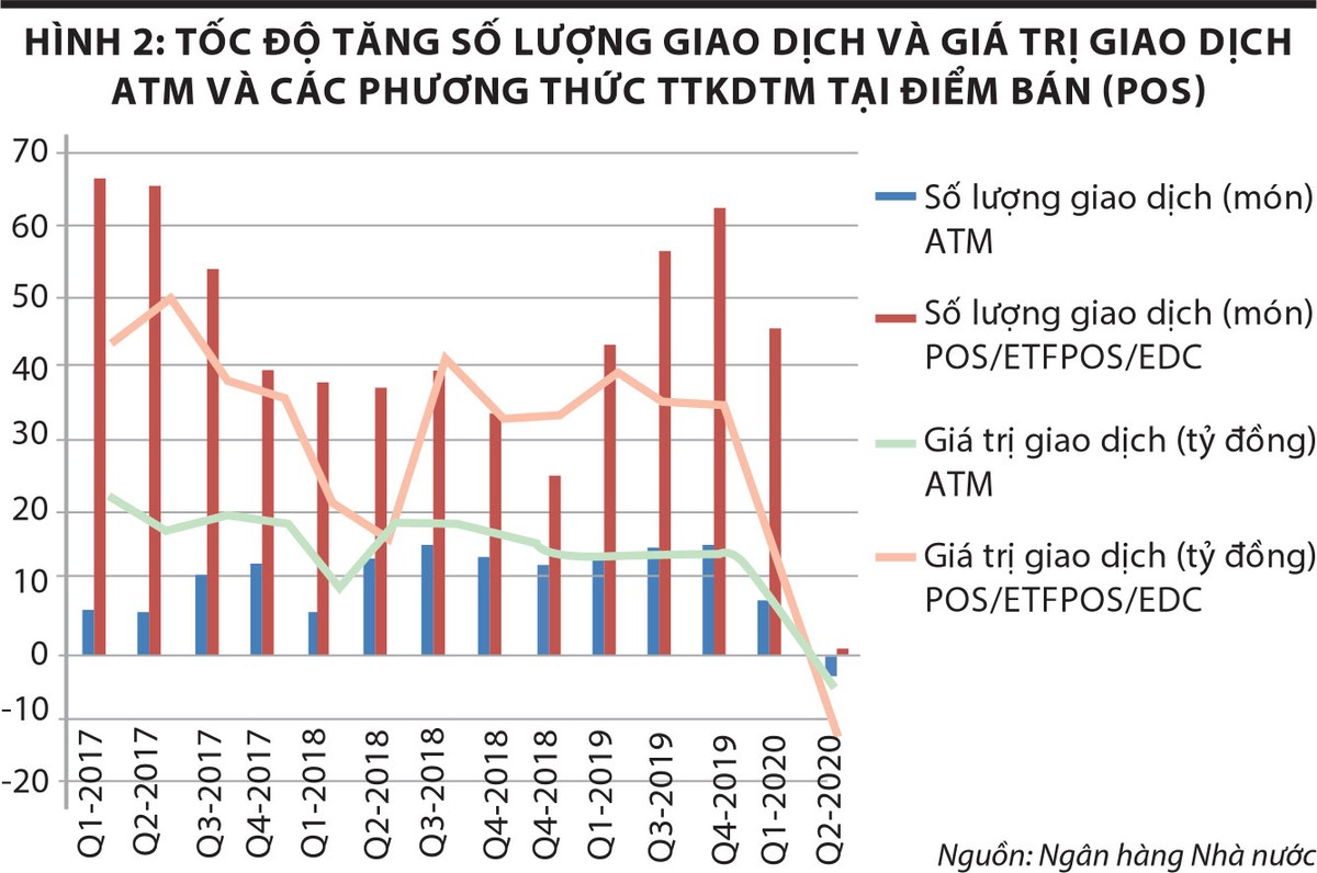 Tuy nhiên, điều đáng ngạc nhiên là khi nền kinh tế bị ảnh hưởng bởi Covid-19, các biện pháp giãn cách được áp dụng và mua bán qua mạng tăng lên, nhưng tốc độ tăng thanh toán không dùng tiền mặt lại giảm, đạt -11,7% (âm 11,7%) vào quý II/2020.