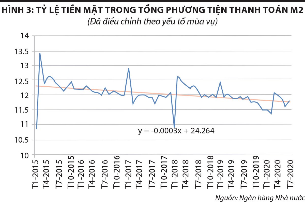 Tỷ lệ sử dụng tiền mặt trong hoạt động thanh toán của Việt Nam năm 2019 theo Tập đoàn Dữ liệu quốc tế (IDG) vào khoảng 80%, tương đương các nước Nhật, Đức. Tỷ lệ tiền mặt trong tổng phương tiện thanh toán M2 giai đoạn từ năm 2015 đến tháng 6/2020 có giảm, nhưng tốc độ giảm rất chậm, ở mức 0,003 điểm phần trăm bình quân mỗi năm (Hình 3).