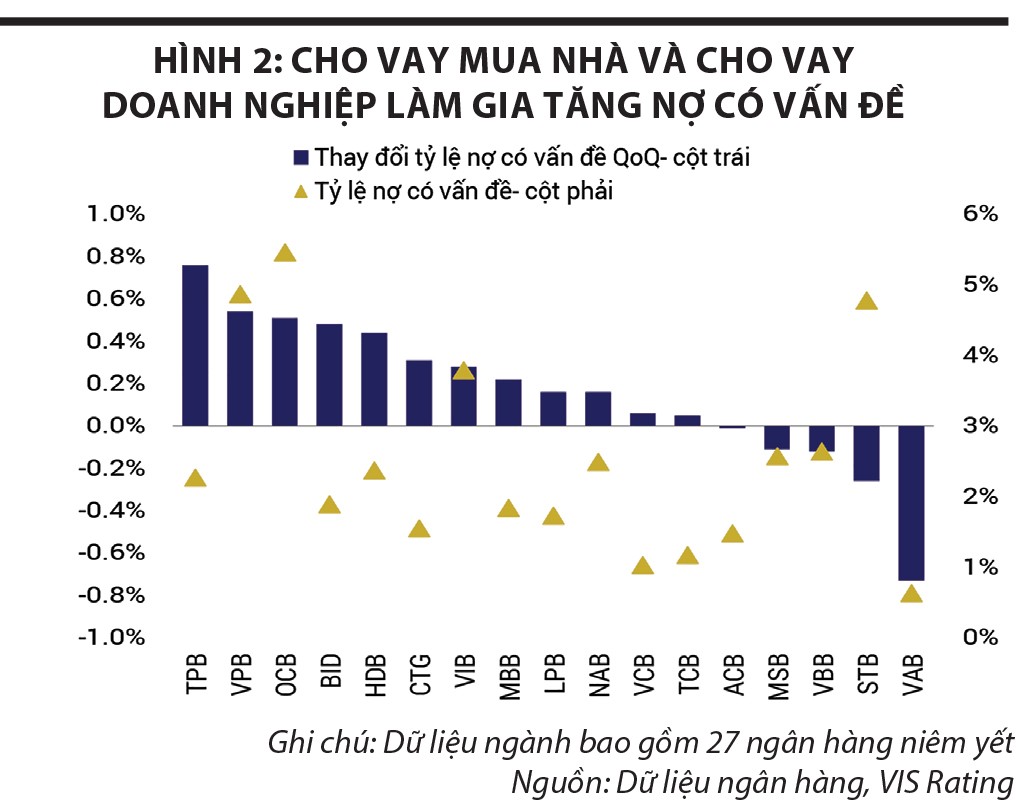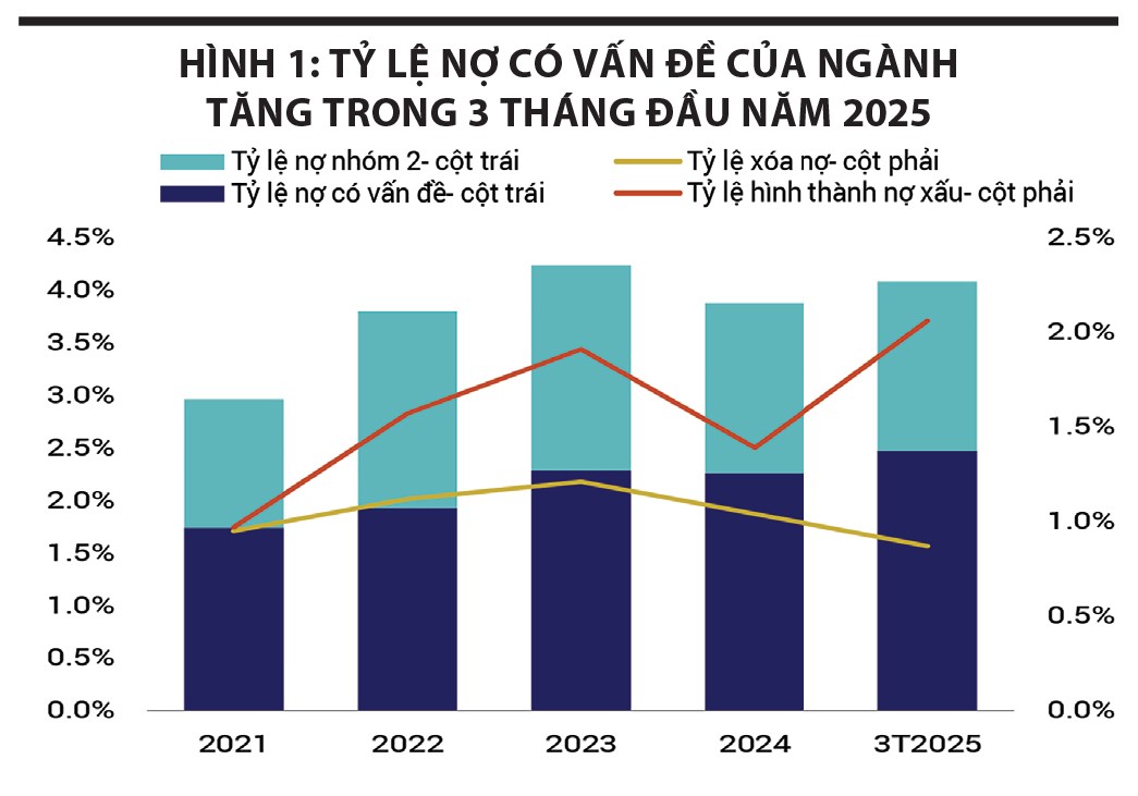 Dựa trên quan sát của chúng tôi đối với 27 ngân hàng niêm yết, tỷ lệ nợ có vấn đề của ngành tăng 0,2% so với quý trước đó, lên mức 2,5% trong 3 tháng đầu năm 2025, với tỷ lệ hình thành nợ xấu gia tăng ở hầu hết các ngân hàng. Cho vay mua nhà cá nhân thuộc phân khúc mang tính đầu cơ hoặc liên quan đến các chủ đầu tư bất động sản gặp khó khăn làm gia tăng nợ xấu ở các ngân hàng tư nhân (như VPB, MBB, OCB, TPB, VIB), trong khi các ngân hàng quốc doanh (như BID, CTG) tăng nợ xấu từ khách hàng doanh nghiệp trong lĩnh vực vật liệu xây dựng. Ngược lại, tỷ lệ hình thành nợ xấu dần ổn định đối với các ngân hàng lớn (như ACB, TCB) do hạn chế cấp tín dụng đối với các chủ đầu tư bất động sản gặp khó khăn.