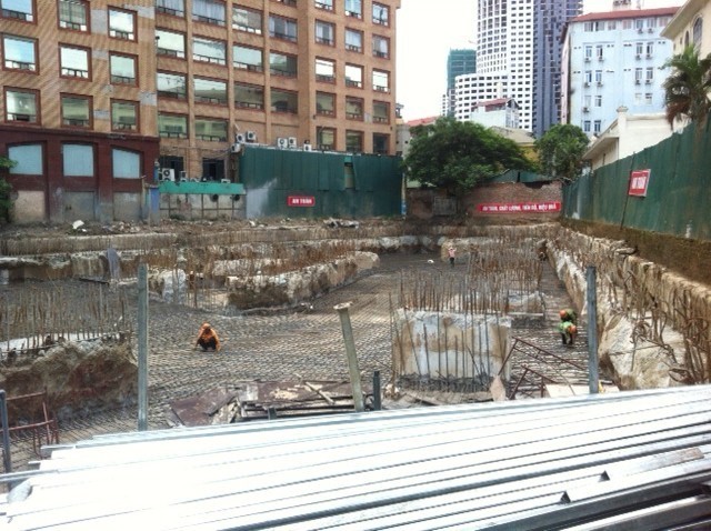 Hình ảnh chụp tiến độ Tháp Doanh nhân vào năm 2015, sau gần 5 năm được khởi công, dự án chỉ nhú lên khỏi mặt đất với tường vây, cọc trong tường vây, cọc khoan nhồi. Sắt thép lâu ngày hoen gỉ, công trường vắng lặng