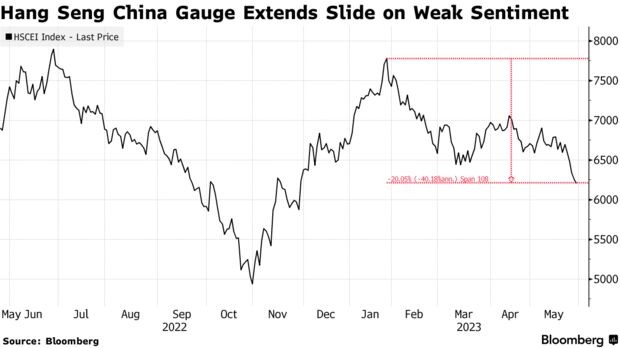 Chỉ số Hang Seng China Enterprises, vốn theo dõi các cổ phiếu của các công ty Trung Quốc niêm yết ở Hồng Kông đã giảm 1% trong ngày 30/5, đánh dấu 5 phiên giảm liên tiếp. So với mức đỉnh xác lập vào ngày 27/01/2023, chỉ số này đã giảm 20%, do đó đã bước chân vào thị trường gấu.