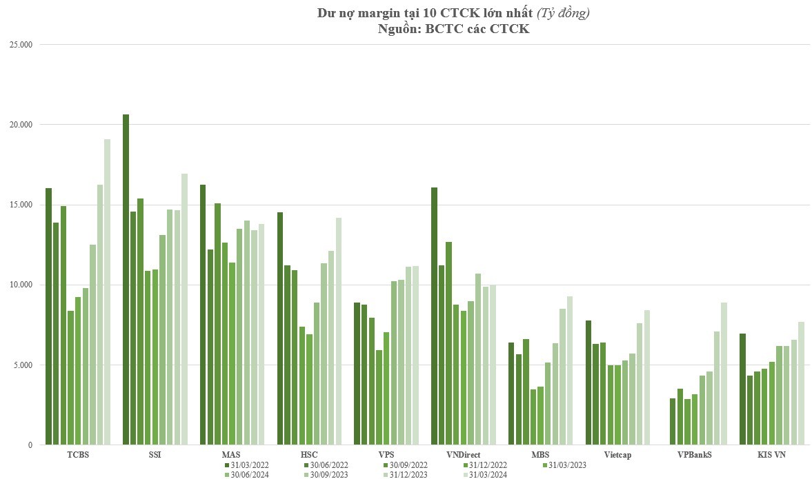 Ghi nhận thời điểm quý cuối năm 2024, dư nợ cho vay ký quỹ (margin) tại 10 CTCK lớn nhất thị trường đạt gần 120.000 tỷ đồng. Xét theo giá trị tuyệt đối, quy mô trên đã vượt mức đỉnh ghi nhận 2 năm trước đó và gấp 3 lần giá trị ghi nhận cuối năm 2019, khi thị trường chứng khoán chuẩn bị bước vào thời kỳ bùng nổ.