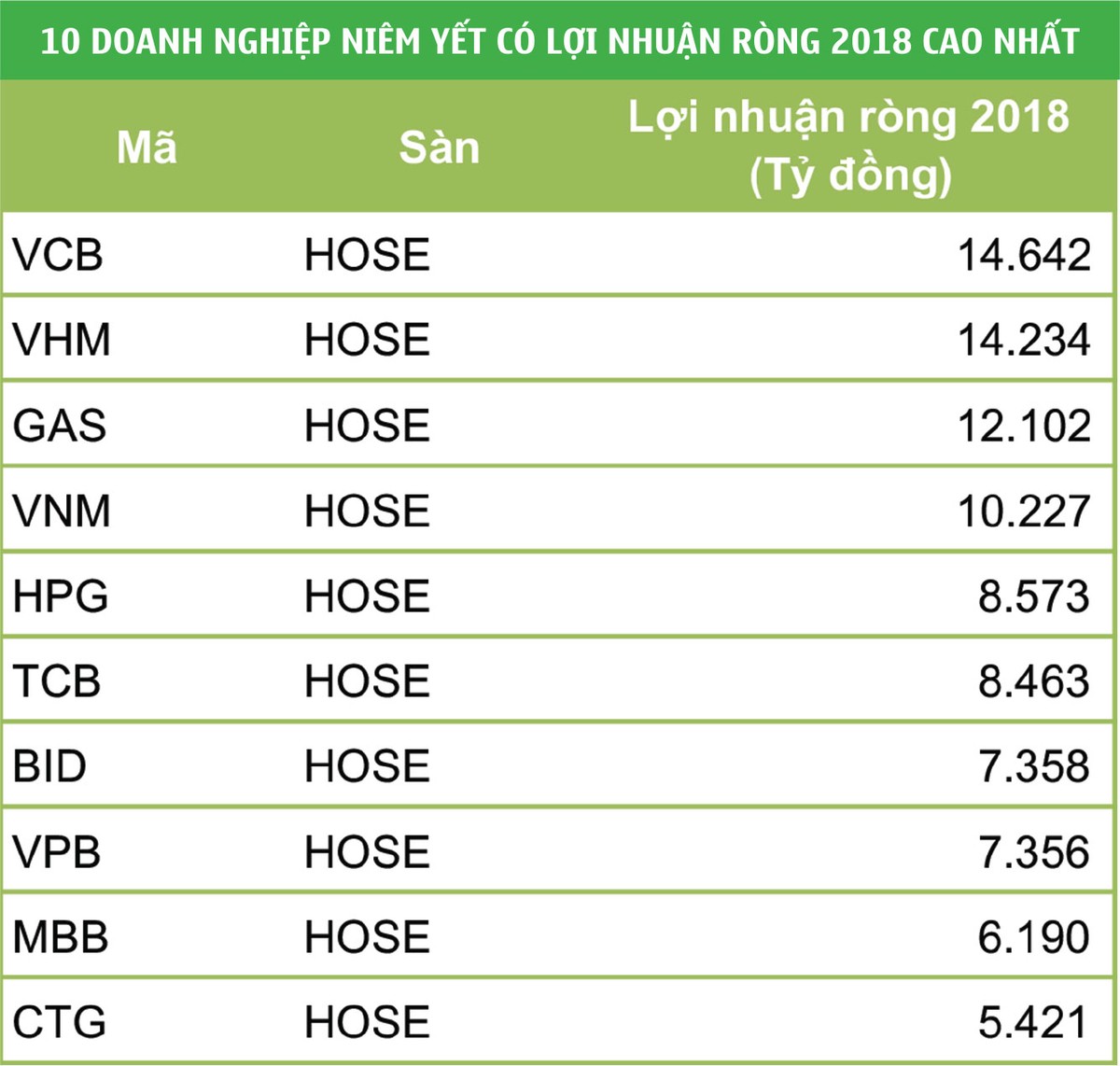 Là doanh nghiệp gây ấn tượng cả về mức tăng trưởng và giá trị lợi nhuận năm 2018, Công ty cổ phần Vinhomes (mã VHM) đạt 14.234 tỷ đồng lợi nhuận sau thuế, tăng 840% so với thực hiện năm 2017. Với mức lãi này, VHM là doanh nghiệp niêm yết có lợi nhuận cao thứ 2 trên sàn chứng khoán (sau Vietcombank với hơn 14.642 tỷ đồng lãi ròng).