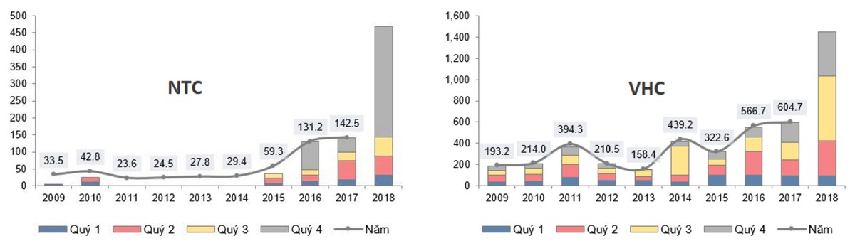Lợi nhuận của NTC và VHC trong 10 năm qua.