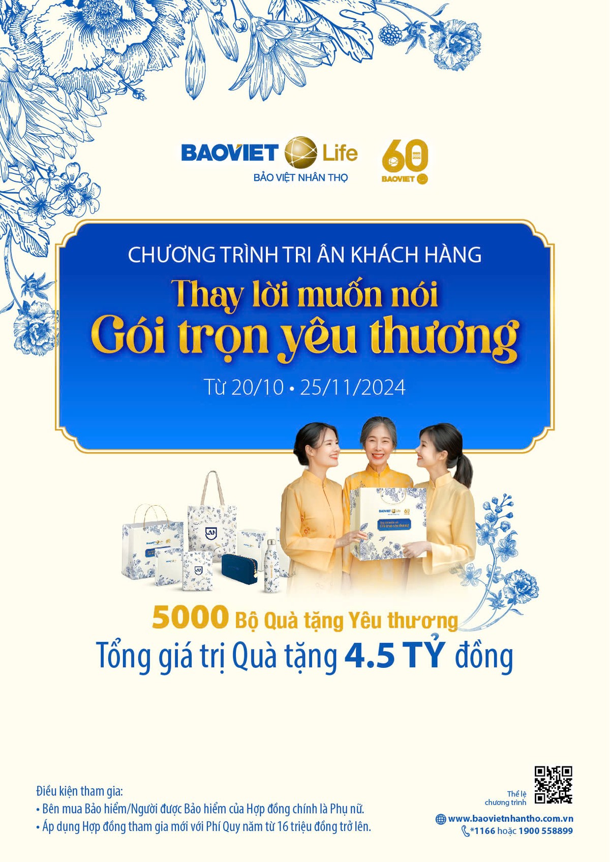 Nhân dịp tháng 10 – tháng tri ân và tôn vinh người Phụ nữ Việt Nam, Bảo Việt Nhân thọ tưng bừng triển khai chương trình khuyến mại hấp dẫn “Thay lời muốn nói, gói trọn yêu thương”, trao tặng 5.000 bộ quà tặng Yêu thương cho các khách hàng nữ khi tham gia hợp đồng mới với Bảo Việt Nhân thọ trên toàn quốc. Chương trình có tổng giá trị quà tặng lên đến 4,5 tỷ đồng, diễn ra từ ngày 20/10/2024 đến hết ngày 25/11/2024.