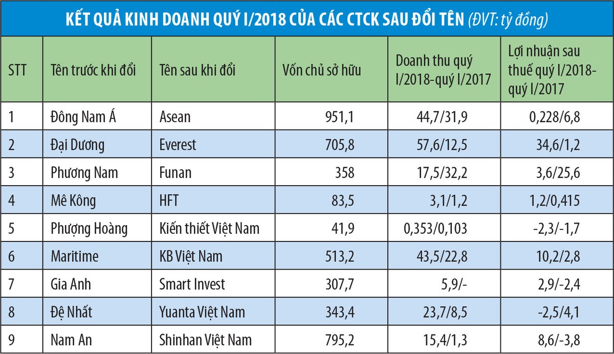 Sau nỗ lực đổi tên và thực thi các bước cải cách về chiến lược hoạt động, trong số 10 công ty chứng khoán đổi tên mà Báo Đầu tư Chứng khoán ghi nhận đến thời điểm này, ngoại trừ Công ty Chứng khoán Hà Thành đang chờ xóa sổ hoạt động, thì 7/9 công ty làm ăn có lãi trong quý I/2018.