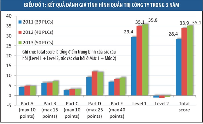 Biểu đồ 1 minh họa tình hình thực thi ứng với mỗi nguyên tắc quản trị công ty của các doanh nghiệp niêm yết được đánh giá trong suốt 3 năm thực hiện dự án. Hầu hết các lĩnh vực đều ghi nhận sự cải thiện trong năm 2013 so với năm 2012 và 2011. Tổng điểm trung bình của năm 2013 là 35,1 (so với 33,9 năm 2012 và 28,4 năm 2011).