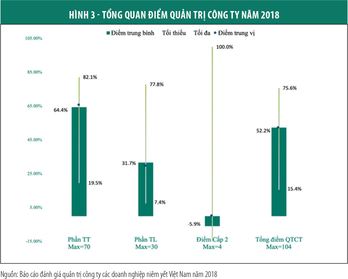 Điểm trung bình QTCT của toàn bộ các doanh nghiệp được đánh giá đạt 54,33 điểm, tức đạt 52,2% so với thang điểm tối đa có thể đạt được (điểm tối đa là 104 điểm). Doanh nghiệp có điểm QTCT cao nhất là 78,7 điểm (đạt 75,6% thang điểm tối đa), doanh nghiệp có điểm QTCT thấp nhất là 16 điểm (đạt 15,38% thang điểm tối đa).