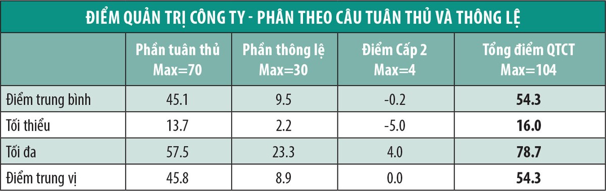 Kết quả đánh giá cho thấy, ở phần tuân thủ, doanh nghiệp niêm yết đạt được điểm trung bình là 45,1 điểm (trên mức điểm tối đa của phần tuân thủ là 70 điểm), tức đạt được 64,4% yêu cầu tuân thủ. Tuy nhiên, mức độ đáp ứng các thông lệ quốc tế tốt còn rất thấp. Các doanh nghiệp niêm yết chỉ đạt được 9,5 điểm cho phần thông lệ, tức đạt 31,7% yêu cầu của thông lệ tốt (phần thông lệ có điểm tối đa là 30 điểm).