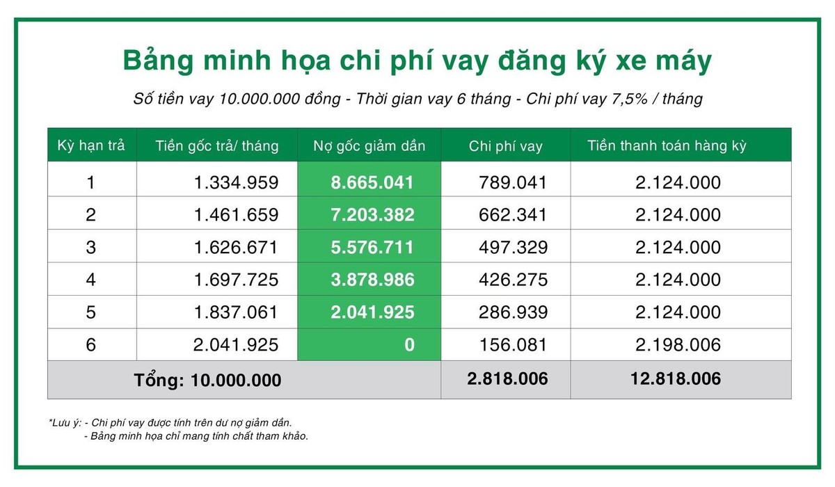 Với các khoản vay ở mức 10 triệu đồng, khách hàng thường chọn trả dần trong vòng 6 tháng. Vậy với chi phí vay 7,5%/tháng theo dư nợ giảm dần trong 6 tháng từ gói sản phẩm của F88, tổng số tiền khách phải trả sẽ rơi vào khoảng 12,8 triệu đồng cả gốc lẫn phí vay. Cụ thể, hàng tháng khách hàng phải trả trung bình cả gốc và chi phí vay là hơn 2,1 triệu đồng.