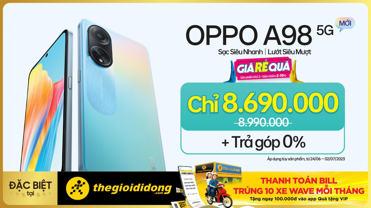 Từ ngày 24/6 - 2/7, khách hàng mua OPPO A98 sẽ được giảm ngay 300.000 đồng và trả góp 0%. Như vậy, sau khuyến mãi khách hàng chỉ cần bỏ ra 8,69 triệu đồng là đã có thể sở hữu sản phẩm với nhiều tính năng vượt trội so với phân khúc.