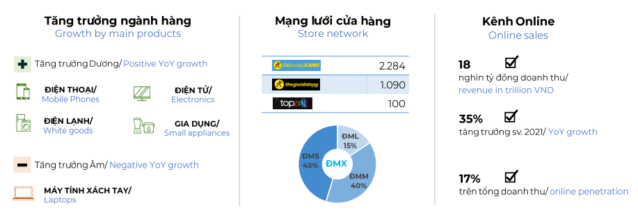Xét về cơ cấu doanh thu, ĐMX chiếm 51,7% tổng doanh thu, TGDĐ chiếm 26% và BHX chiếm 20,3%. Điện thoại, phụ kiện và thiết bị di động vẫn là sản phẩm mang về doanh thu lớn nhất chiếm 40% doanh thu sản phẩm; điện máy chiếm 32%; thực phẩm và FMCGs chiếm 20%.