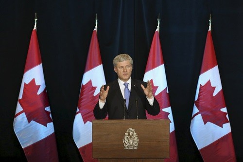Thủ tướng Canada Stephen Harper trong cuộc họp báo về TPP hôm qua. Ảnh:Reuters