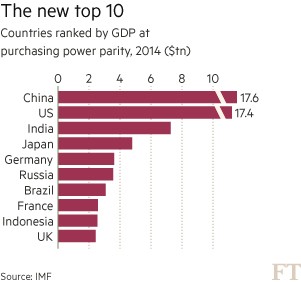 Phương pháp tính GDP theo sức mua cũng khẳng định rằng, Trung Quốc hiện là nền kinh tế lớn nhất thế giới, vượt qua Mỹ (theo báo cáo hồi tháng 4 thì chưa vượt). Nếu xét theo tỷ giá hối đoái trên thị trường thì nền kinh tế Mỹ có quy mô 17,4 nghìn tỷ USD, còn Trung Quốc là 10,4 nghìn tỷ USD. Nhưng nếu điều chỉnh theo giá cả tương đối thì nền Trung Quốc chuyển lên vị trí số một với GDP trị giá 17,6 nghìn tỷ USD.