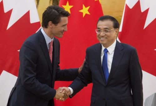 Thủ tướng Canada Justin Trudeau (trái) bắt tay người đồng cấp Trung Quốc Lý Khắc Cường khi tới thăm Bắc Kinh năm 2016. Ảnh: AP.