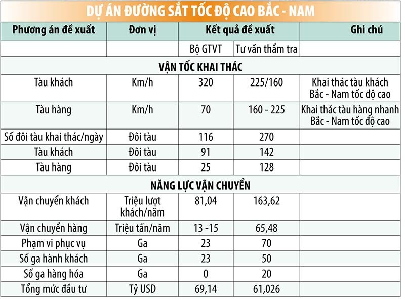 Cần phải nói thêm rằng, tại Tờ trình số 1281/TTr - BGTVT ngày 14/2/2019 về Báo cáo nghiên cứu tiền khả thi Dự án, Bộ GTVT đề xuất nâng cấp tuyến đường sắt hiện tại đạt tốc độ 70 km/h cho tàu khách địa phương và tàu hàng; đầu tư xây dựng mới tuyến đường sắt tốc độ cao trên Hành lang Bắc - Nam dài 1.559 km, đường đôi, khổ tiêu chuẩn 1.435 mm, điện khí hóa, vận chuyển hành khách, có tốc độ thiết kế 350 km/h, tốc độ khai thác 320 km/h. Tổng mức đầu tư Dự án ước khoảng 58,71 tỷ USD, trong đó vốn nhà nước chiếm khoảng 80%, vốn tư nhân khoảng 20%.