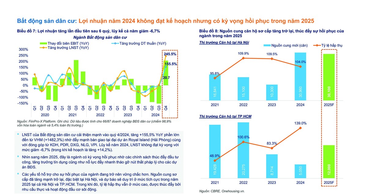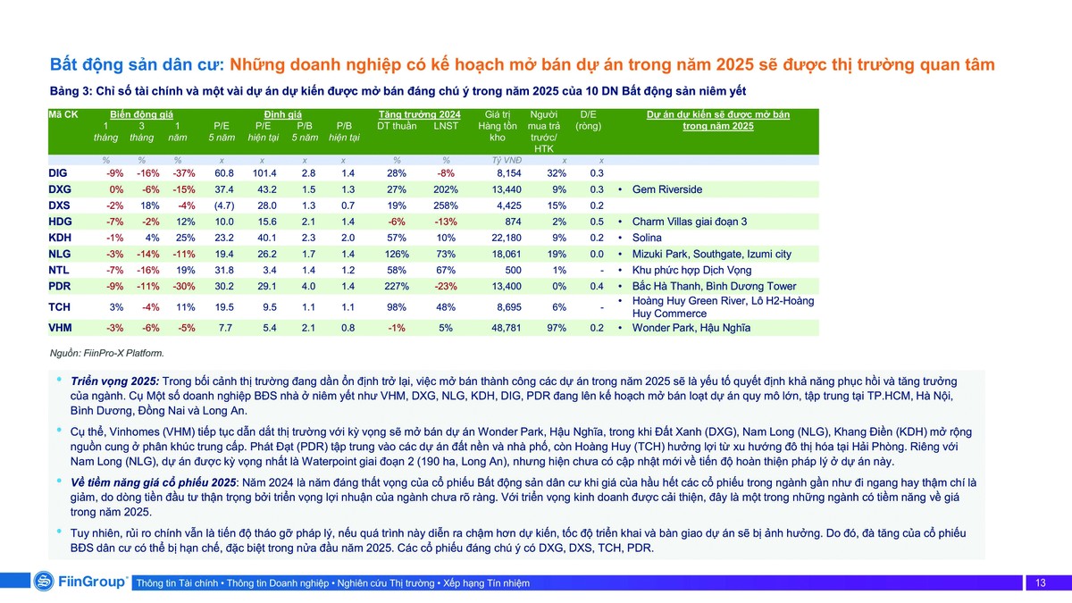 Nhận định về triển vọng của bất động sản dân cư năm 2025, theo các chuyên gia tới từ FiinTrade, đây là nhóm ngành có kỳ vọng hồi phục sớm nhờ các chính sách thúc đẩy đầu tư công, tín dụng địa ốc cởi mở cũng như nỗ lực đẩy nhanh gỡ vướng pháp lý cho các doanh nghiệp, dự án.
