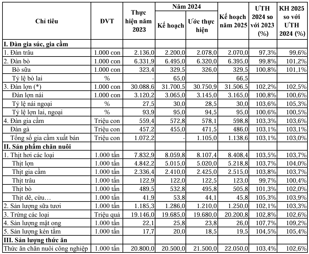 Về triển vọng ngành chăn nuôi tại Việt Nam, theo báo cáo của Bộ NN&PTNT, sản lượng thịt hơi các loại ước đạt 8,1 triệu tấn trong năm 2024 (tăng 3,5% so với năm 2023); trong đó thịt heo hơi 5 triệu tấn (tăng 3,7%). Sản lượng thức ăn chăn nuôi công nghiệp quy đổi 21,5 triệu tấn (tăng 3,4%). Mục tiêu cho ngành chăn nuôi năm 2025 mà Bộ NN&PTNT đặt ra với sản lượng thịt hơi khoảng 8,4 triệu tấn (tăng 3,5%), sản lượng thức ăn chăn nuôi công nghiệp quy đổi 22,05 triệu tấn (tăng 3,4%).