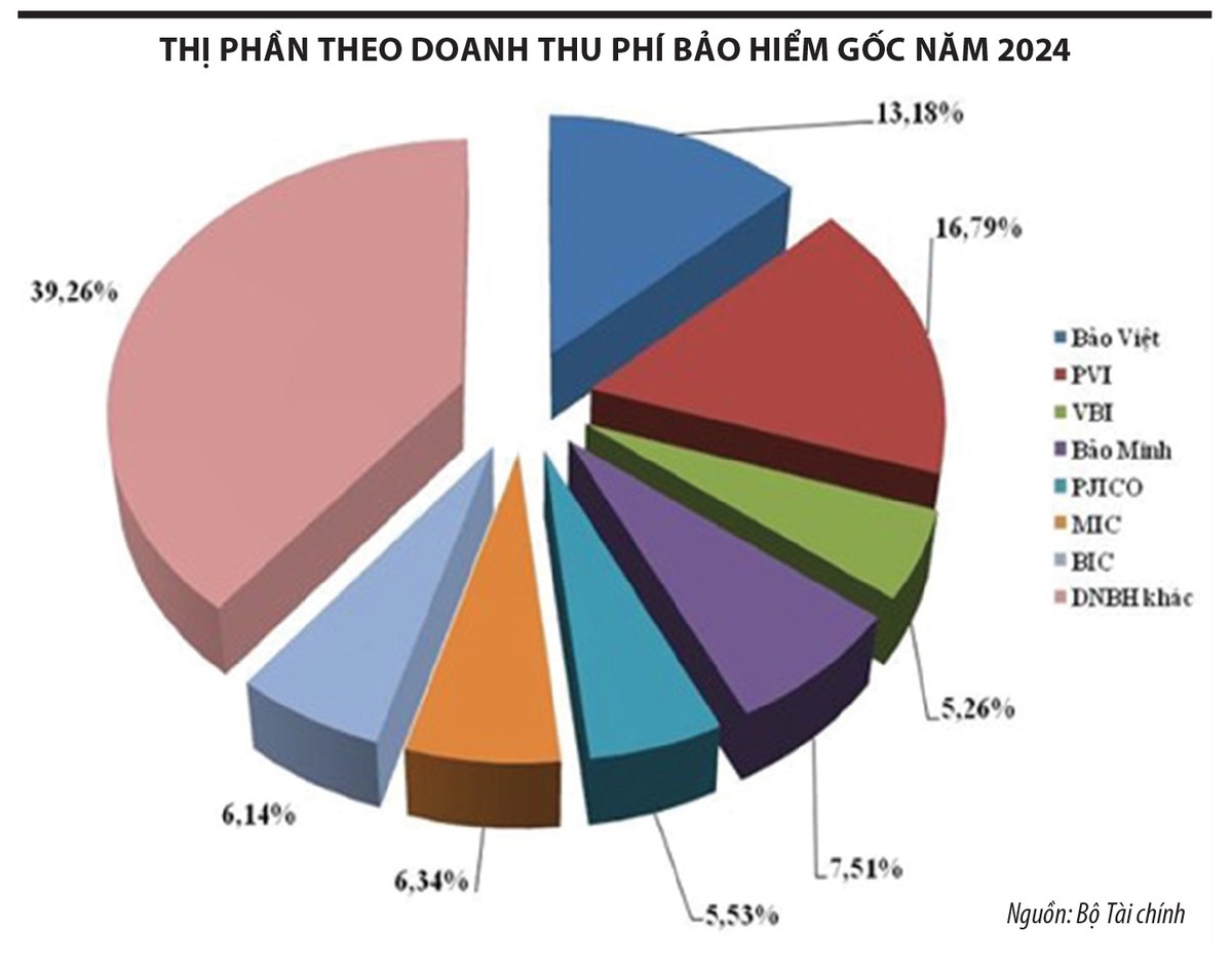 Số liệu của Bộ Tài chính cũng cho thấy, năm 2024, doanh thu phí bảo hiểm gốc của thị trường phi nhân thọ ước đạt 79.363 tỷ đồng, tăng 11,68% so với năm 2023. Trong tốp 5 doanh nghiệp có thị phần lớn nhất, dẫn đầu về doanh thu phí gốc vẫn là Bảo hiểm PVI chiếm 16,79% thị phần, doanh thu ước đạt 13.326 tỷ đồng, tăng 21,12% so với năm 2023; tiếp đến là Bảo hiểm Bảo Việt chiếm 13,18% thị phần, doanh thu ước đạt 10.457 tỷ đồng, tăng 3,09%; Bảo hiểm Bảo Minh (BMI) chiếm 7,51% thị phần, doanh thu ước đạt 5.961 tỷ đồng, tăng 7,22%; Bảo hiểm Quân đội (MIC) chiếm 6,34% thị phần, doanh thu ước đạt 5.034 tỷ đồng, tăng 7,31%; Bảo hiểm BIDV (BIC) chiếm 6,14% thị phần, doanh thu ước đạt 4.870 tỷ đồng, tăng 6,87%.