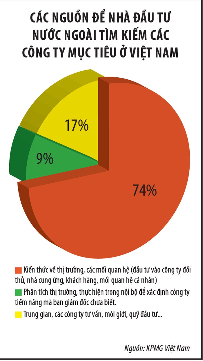 TS. Nguyễn Công Ái, Phó tổng giám đốc Công ty Kiểm toán và Tư vấn KPMG tại Việt Nam chia sẻ, các nhà đầu tư nước ngoài thường gặp nhiều khó khăn trong việc tìm kiếm các công ty mục tiêu ở Việt Nam. Nguyên nhân chính là họ khó xác định người có thẩm quyền quyết định chính, nếu xác định được thì khả năng tiếp cận cũng hạn chế. Đó là chưa kể đến sự khác biệt về ngôn ngữ, văn hóa.