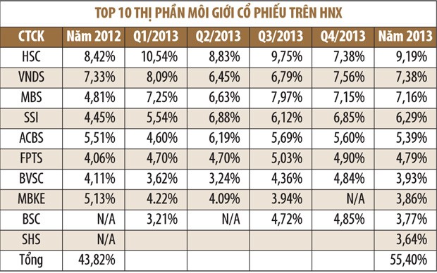 10 CTCK thị phần môi giới lớn nhất trên HOSE chiếm 62,6% thị phần, trên HNX là 55,4%. Trong khi đó, con số này trong năm 2012 lần lượt là 57,53% và 51,65%. Điều này cũng đồng nghĩa với việc, miếng bánh thị phần cho các CTCK ở top dưới đang ngày một nhỏ lại.