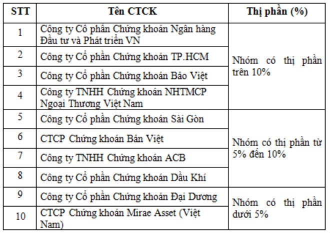 Tổng cộng, thị phần của top 10 trên HOSE đã chiếm tới 63,33% toàn thị trường.