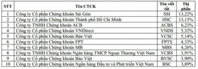 Tổng cộng, top 10 môi giới cổ phiếu trên HNX chiếm hơn 58% thị phần toàn thị trường.